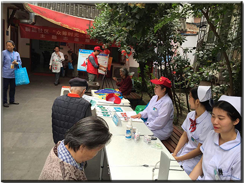 义诊场地设置的问诊咨询台前,吸引了大量市民前来询医问诊。医护工作者为群众提供血压、血糖免费普查和护理等服务。
